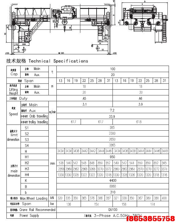 注:Gn=額定起重噸位 S=跨度(左軌道中心至右軌道中心的距離) H=提升高度(地面至吊鉤最高點的距離)